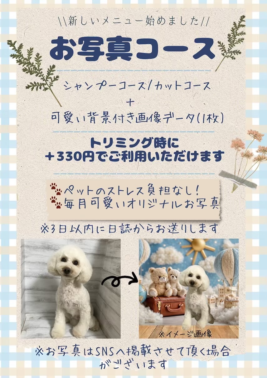 | お手入れ5点セット (爪切り・耳掃除・肛門絞り・足裏バリカン・足周りカット) | 2,200円 | 2,750円 | 3,300円 |